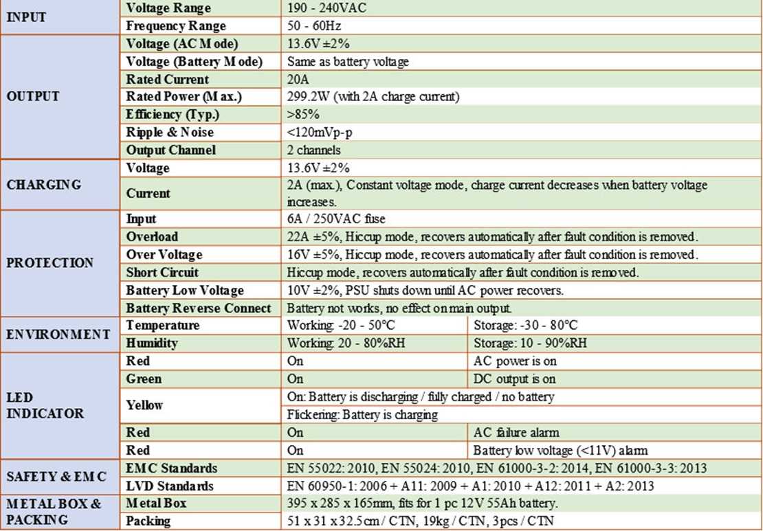 Thông số kỹ thuật bộ nguồn backup 12V-20A