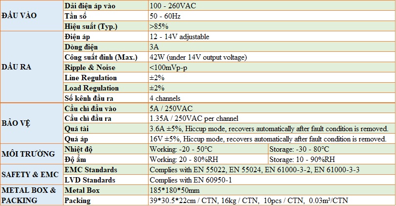 Công suất cựa đại 42W tích hợp 04 kênh đầu ra riêng biệt cấp nguồn cho 04 camera có cầu chì bảo vệ chống ngắn mạch cho từng kênh