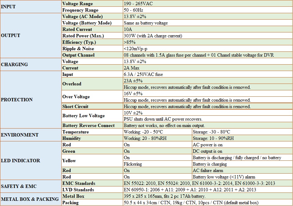 Bộ nguồn dự phòng UPS 12VDC-10A tích hợp 08 kênh đầu ra dùng cho 08 cameras và đầu ghi hình ứng dụng cho hệ thống camera giám sát ( bao gồm cả hệ thống cmaera AnalogHD và camera IP ). Bộ nguồn UPS tích hợp bo mạch 08 kênh đầu ra 12VDC dùng cho 08 camera tích hợp cầu chì ống thủy tinh bảo vệ chống ngắn mạch cho từng kênh.
