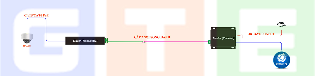 1 - Chuyển đổi và truyền tín hiệu mạng PoE cho camera IP trong thang máy sử dụng nguồn Adaptor DC 48~56V cho bộ Master