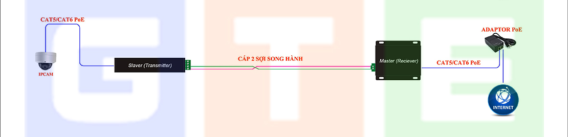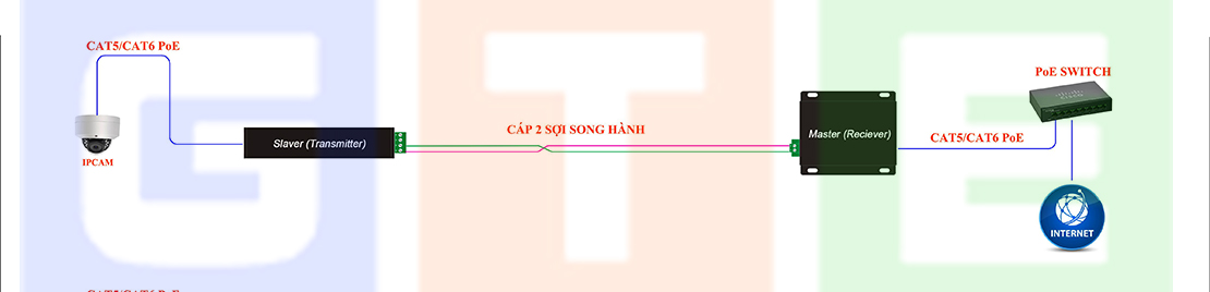 2 - Chuyển đổi và truyền tín hiệu mạng PoE khoảng cách xa, truyền tín hiệu PoE cho thang máy sử dụng nguồn cấp từ Switch PoE hoặc Adaptor PoE.