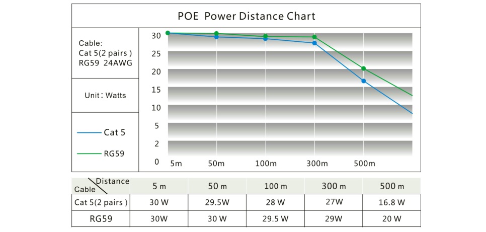 Trong trường hợp sử dụng thiết bị truyền tín hiệu mạng PoE trên cáp 2 sợi song hành. nguồn điện sẽ bị suy hao trên đường dây. bảng thông số về công suất suy hao theo khoảng cách truyền tín hiệu mạng PoE