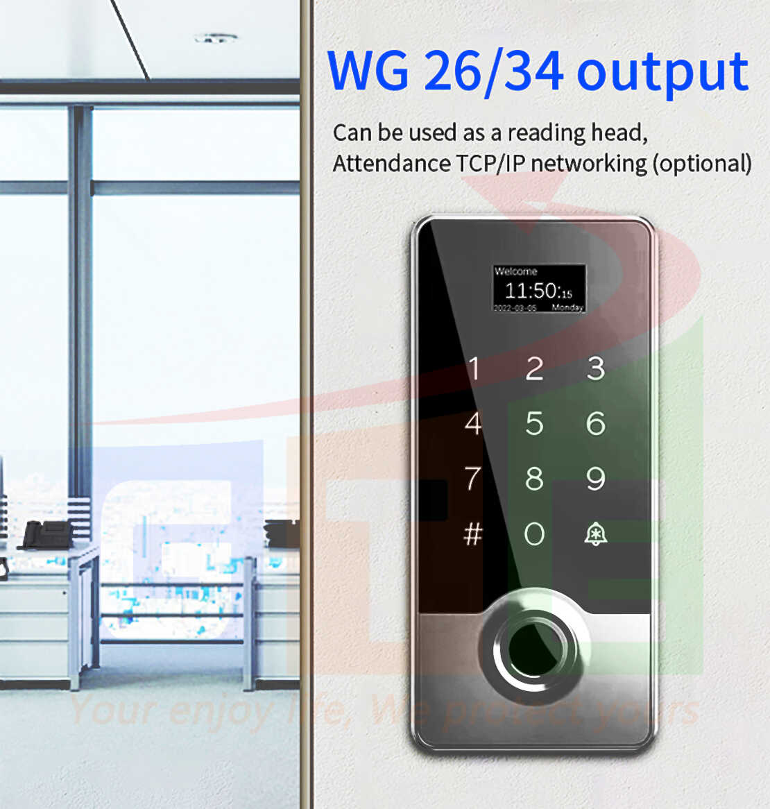 * Hỗ trợ Wiegand output 26/34bits cho phép kết nối với các controller của hãng thứ 3 cho hệ thống kiểm soát truy cập với mức độ an toàn cao nhất.