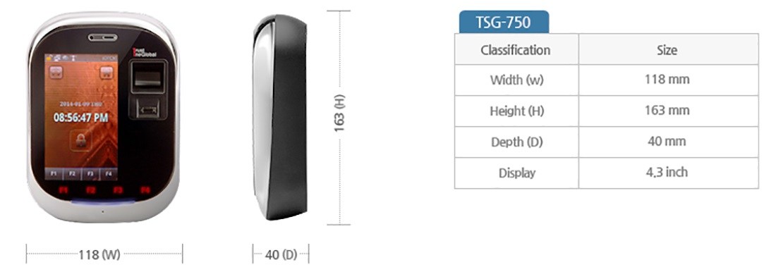 Thông số kỹ thuật đầu đọc vân tay tích hợp trung tâm kiểm soát truy cập Hàn Quốc TSG-750