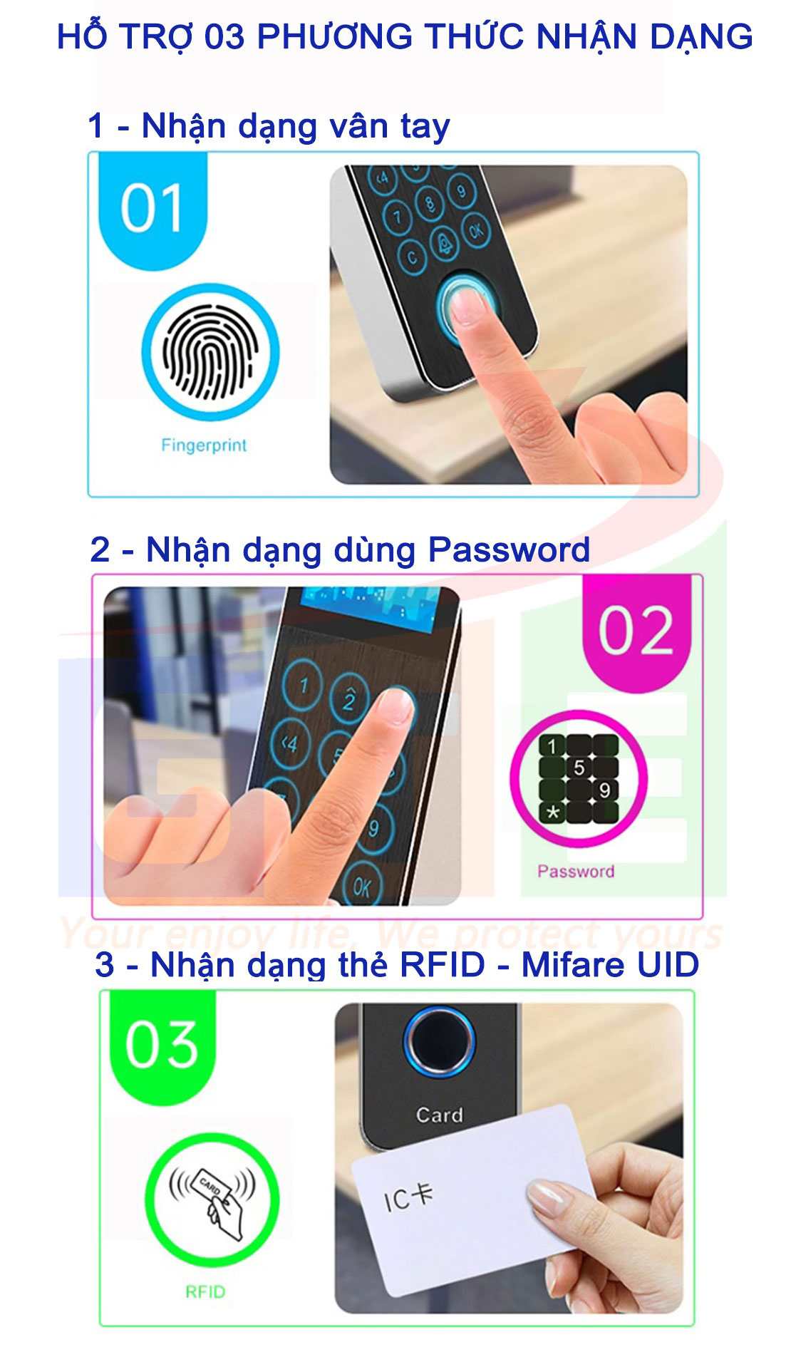 | Phương thức nhận dạng | Vân tay, mã ID, thẻ Mifare, thẻ FRID | ||