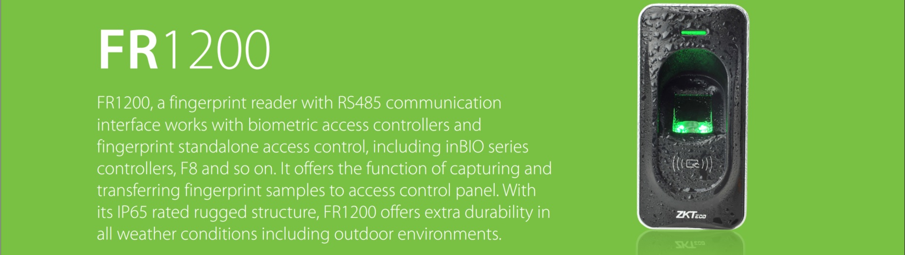 Đầu đọc vân tay kết hợp đọc thẻ FR1200, là một đầu đọc vân tay và thẻ với giao diện truyền thông RS485 làm việc với bộ điều khiển truy cập sinh trắc học và kiểm soát truy cập độc lập dùng vân tay, bao gồm bộ điều khiển loạt inBIO, F8 .....hoặc trung tâm kiểm soát cửa của hãng thứ 3. Nó cung cấp chức năng nhận dạng đọc mẫu vân tay và chuyển mẫu vân tay đến bảng điều khiển truy cập ( access controller ). Với cấu trúc chắc chắn được xếp hạng tiêu chuẩn kháng nước IP65, Đầu đọc vân tay kết hợp đọc thẻ FR1200 mang lại độ bền cao hơn trong mọi điều kiện thời tiết bao gồm cả môi trường ngoài trời.