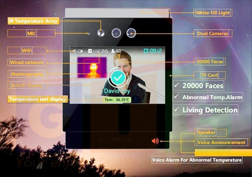 Thiết bị chính của giải pháp kiểm soát truy cập tích hợp sàng lọc thân nhiệt này là thiết bị nhận dạng khuôn mặt tích hợp cảm biết đo nhiệt độ