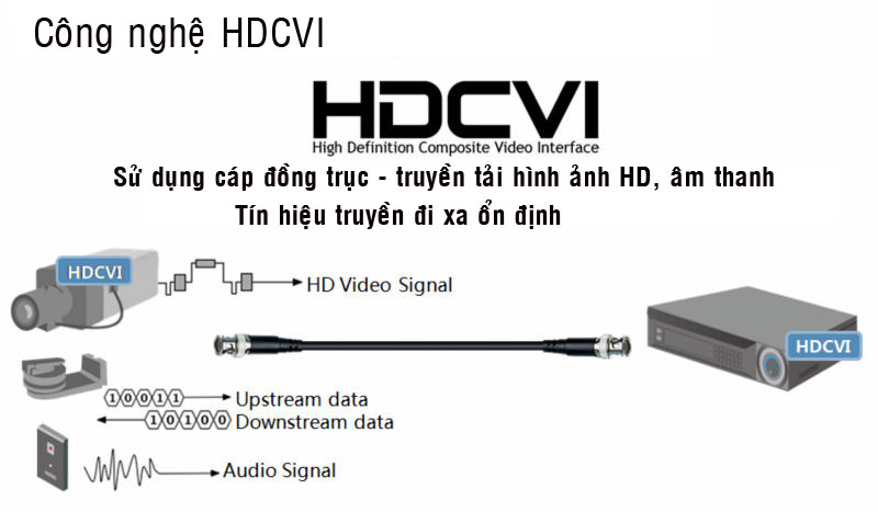 Hệ thống camera HDCVI có khả năng truyền tải các tín hiệu đồng bộ qua cùng một dây cáp, gồm: tín hiệu hình ảnh độ nét cao, tín hiệu âm thanh. Tín hiệu trao đổi dữ liệu 2 chiều thu – nhận.