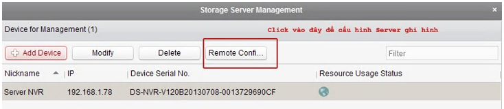 - Click vào Remote Configuration để cấu hình server ghi hình: