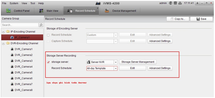 - Khai báo camera cần ghi hình: Chọn camera và check “Storage server recording”