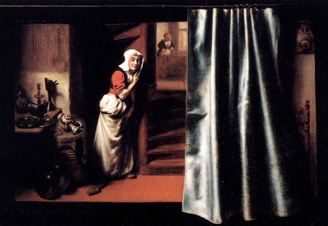Trong ảnh Nikolaes Maes nghe lén những lời tâm sự với một người phụ nữ trong phòng của chồng ( Amsterdam 1655 )