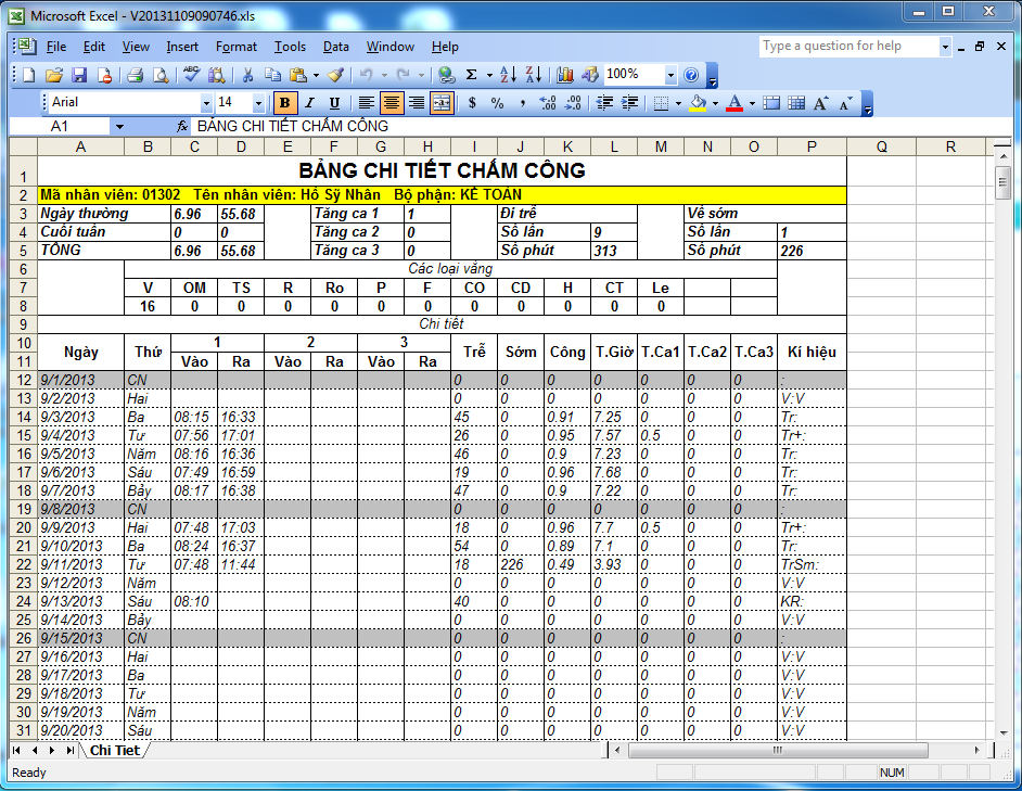 d. Bảng chấm công Excel thống kê theo kí hiệu, Bảng chấm công Excel tổng giờ và giờ tăng ca.