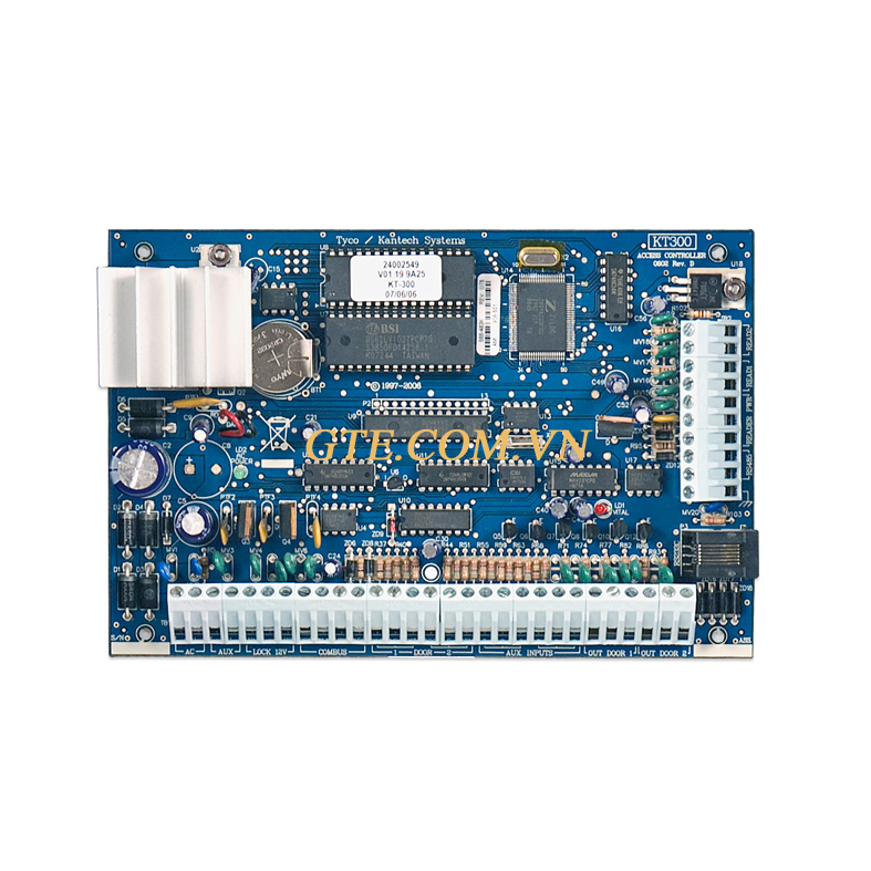 • KT-300 là bộ điều khiển kết nối 2 đầu đọc, có thể điều khiển 1 cửa (giám sát cả lối ra và lối vào) hoặc điều khiển 2 cửa (giám sát lối vào bằng đầu đọc, lối ra sử dụng nút bấm mở cửa). Bộ điều khiển cho phép kết nối đến tất cả các thiết bị cần thiết cho hệ thống kiểm soát ra vào và kết nối đến các bộ điều khiển khác tạo thành hệ thống hàng triệu cửa. Khi mất kết nối mạng hoặc lỗi hệ thống, bộ điều khiển hoạt động ở chế độ độc lập (Stand-alone) nhờ ắc quy dự phòng, khi kết nối với hệ thống được thiết lập, toàn bộ dữ liệu sự kiện và dữ liệu chủ thẻ được đồng bộ với phần mềm EntraPass. Bộ điều khiển cũng có bộ nhớ Flash cho phép nâng cấp Firmware từ máy trạm trong vài phút.