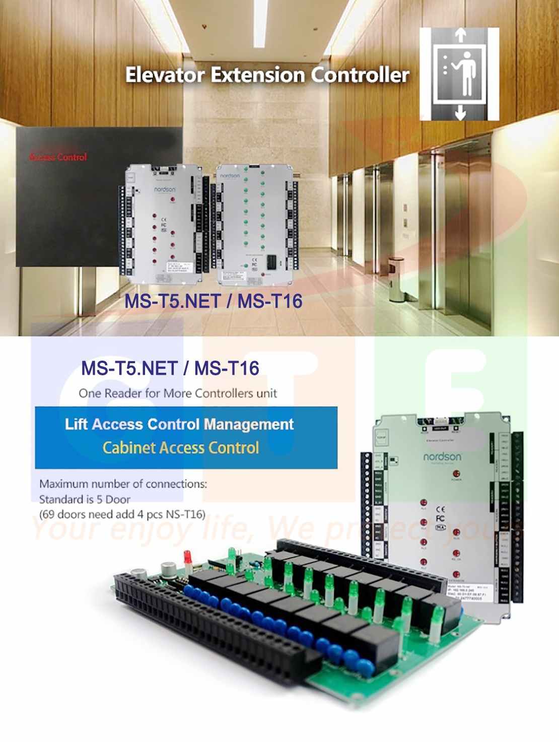 * Hệ thống kiểm soát thang máy có kiểm soát tầng. MS-T5.NET kết nối 1 đầu đọc nhận dạng thẻ hoặc vân tay điều khiển 05 đầy ra relay cho 05 nhóm kiểm soát phân tầng cho thang máy - Nó có thể mở rộng với Bo mạch mở rộng MS-T16 tối đa lên tới 60 relays cho 69 nhóm kiểm soát phân tầng thang máy.